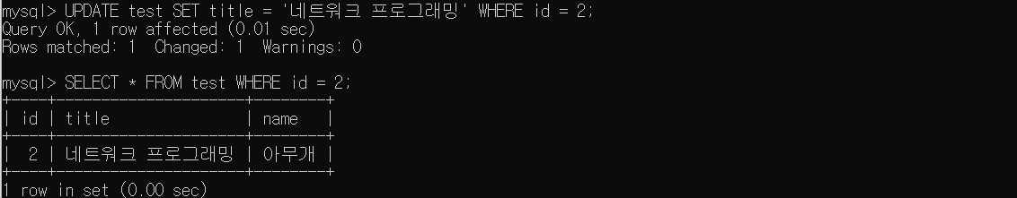 위와 같이 UPDATE (table name) SET (column name = data) WHERE (조건); 을 통해 원하는 값을 바꿀 수 있다.