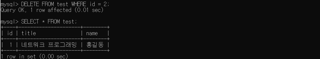 DELETE FROM (table name) WHERE (조건); 을 통해 원하는 데이터를 삭제할 수 있다.