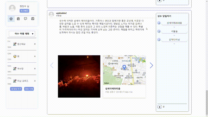kakao map api를 통해 업로드 하고자 하는 장소를 검색하고 다양한 정보를 포함해 포스트의 업로드가 가능하다.